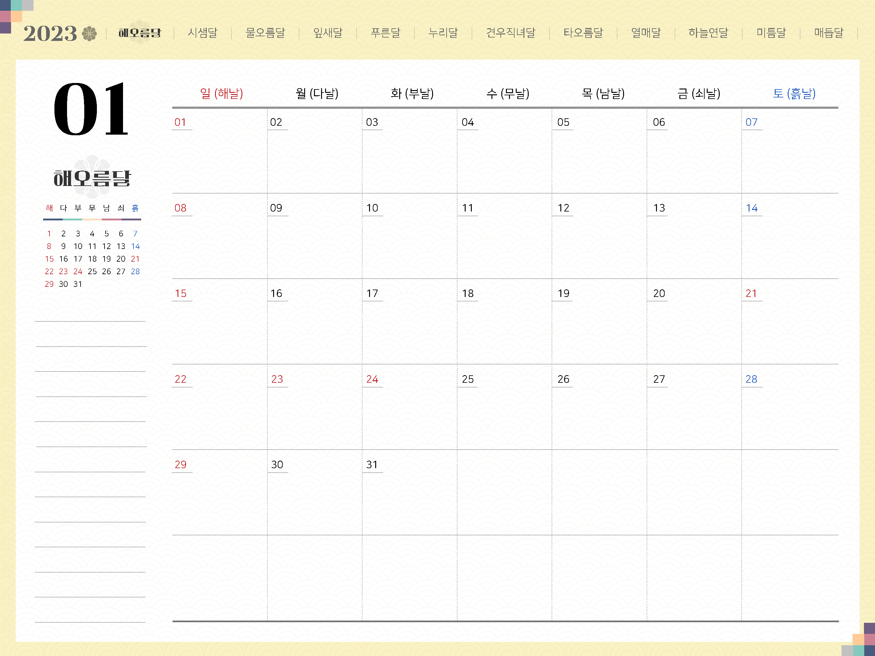 순 우리말의 날짜와 요일표시를 한눈에 보실 수있습니다.