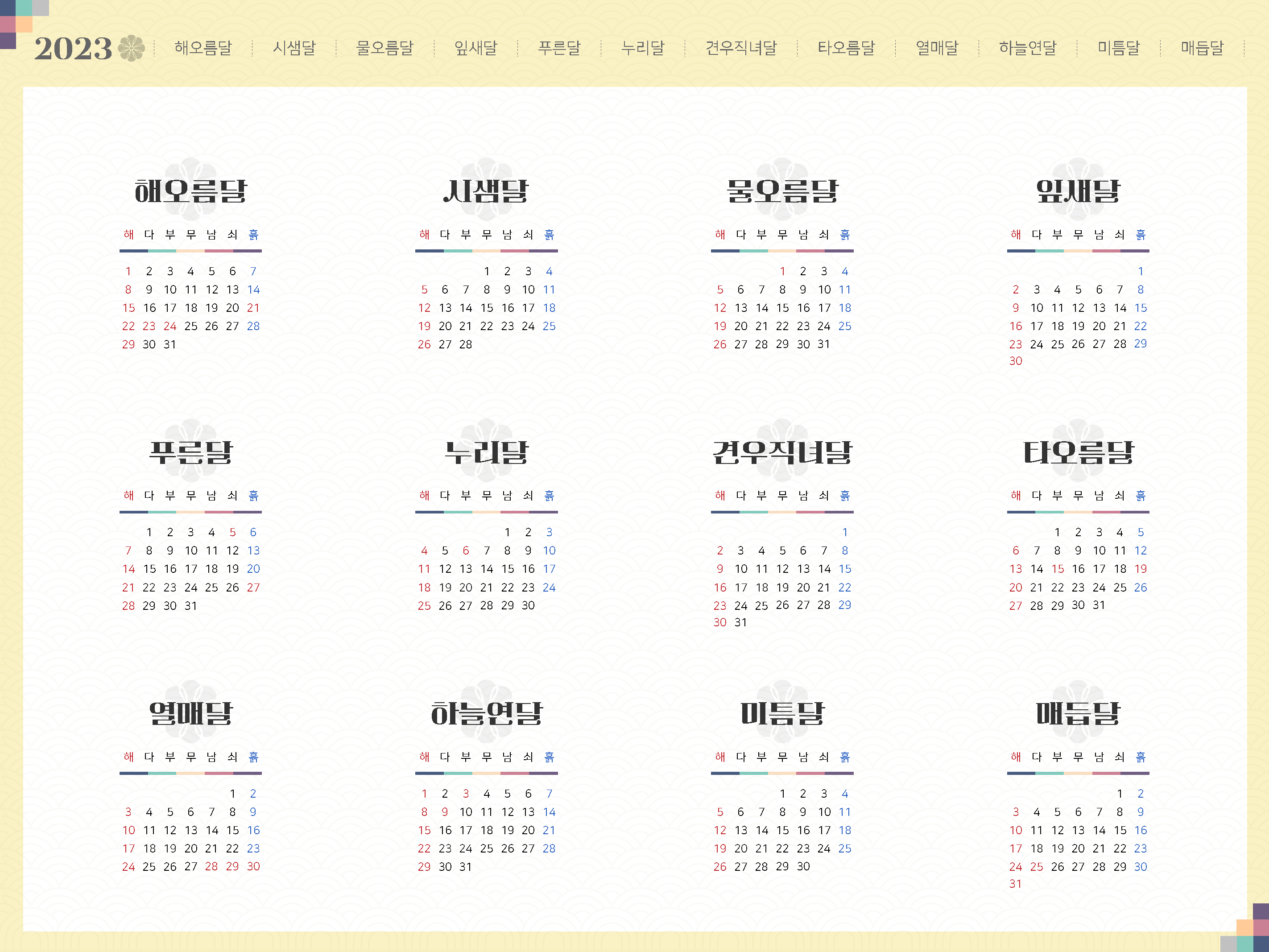 순 우리말의 날짜와 요일표시를 한눈에 보실 수있습니다.